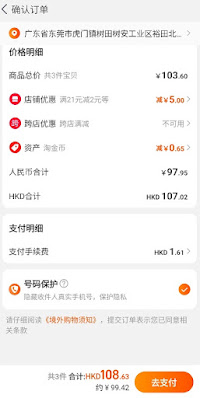 office address as the default on the Taobao app. At the checkout, the total